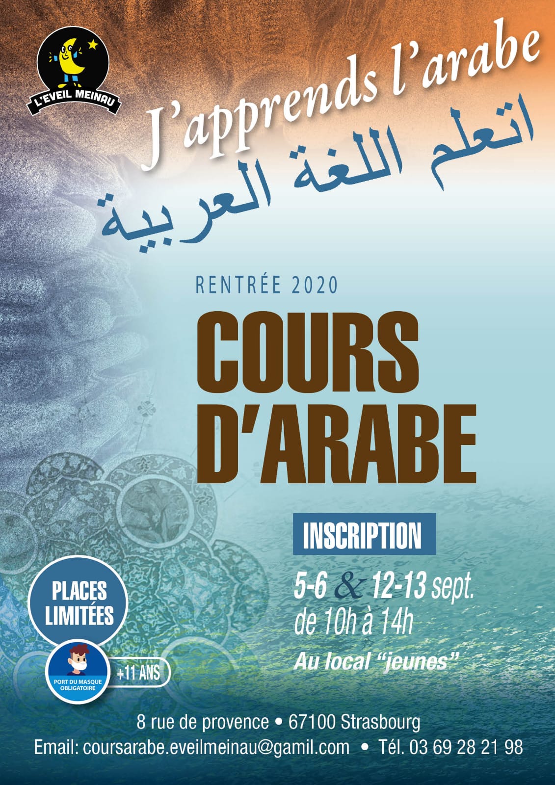 السلام عليكم ورحمة الله وبركاته Chers parents,Nous avons le plaisir de vous informer que les inscriptions des cours arabe de l'association Éveil Meinau sont ouvertes pour l'année 2020/2021.Vous êtes sollicité à se présenter au local de l'associ ..